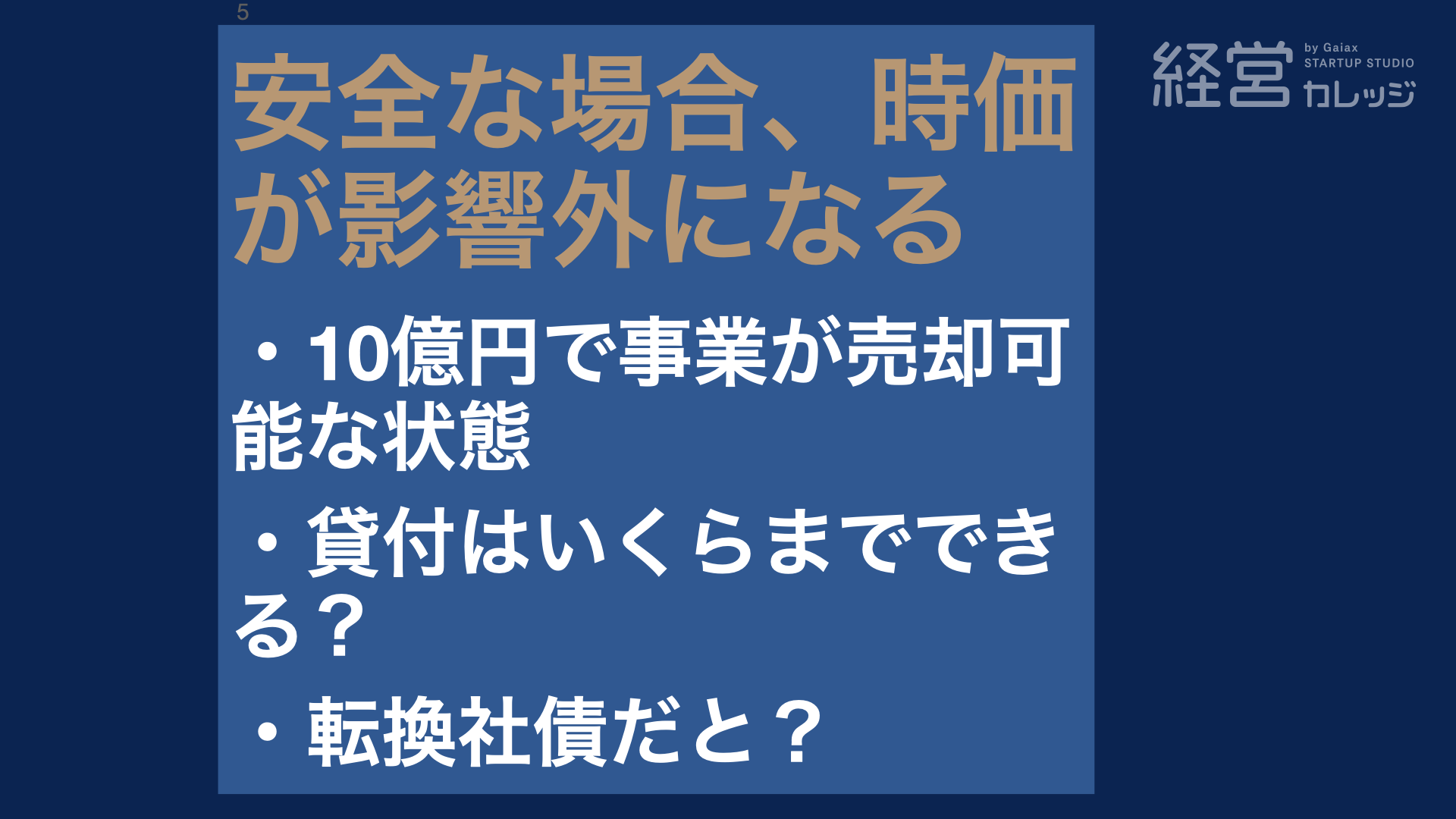 そうですね 例えば創業者に連帯保証を取った時に、5億円が創業者の手に入ることは固いので、5億円は固いと言うのは 1つのロジックですよね。