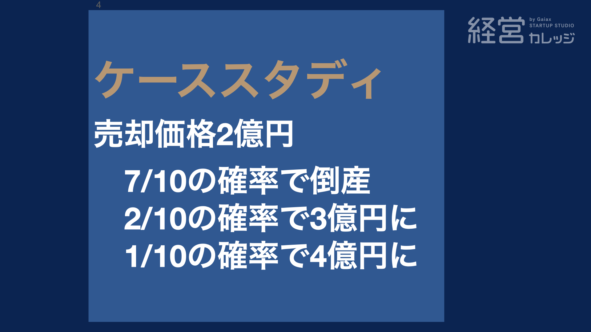 1/10の確率でリスクとったとしても、2億円しか増えないというか、結局4億円にしかならないし、それだったらもう今、倒産する確率も7/10あって高いならば、もう今すぐ売却した方が 良いのではないですかね。