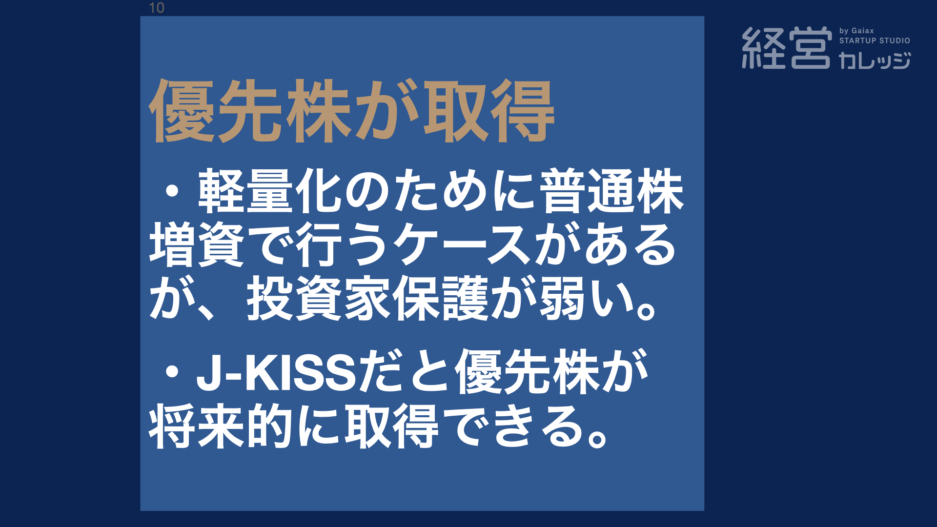 立ち上げたばかりの新規事業を経営する経営者にとって、交渉をしながら進める優先株の設計コストは高いものです。J-KISSなど、立ち上げ初期の負担を削減するために作られた資金調達のフォーマットについてレクチャーします。